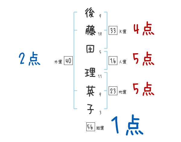 人運![]() | 後藤田理英子さんの人運は16画の5つ星!人望が厚く大きく発展する。逆転成功が見える。 性格や才能などを表す2番目に重要な運勢です。人間関係や協調性、社会的な成功に影響します。主に20歳から50歳ぐらいまでの中年期の運勢を表します。 |