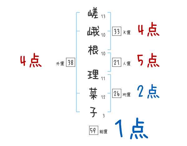 総運![]() | 嵯峨根理菜子さんの総運は59画の1つ星!意志の弱さであきらめることが多いかも。粘り強さが必要。 あなたの人生を表す1番重要な運勢です。生涯を通じて影響する総合運となり、主に50歳以降の晩年期に影響を及ぼします。 |