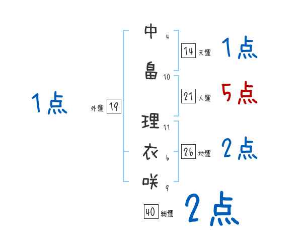 外運![]() | 中畠理衣咲さんの外運は19画の1つ星!優れた才能を持ちますが、協調性が足りないことも。周りの人と協力する事を意識しましょう。 生活面を象徴する運勢です。外部から受ける影響力を表し、結婚運、家庭運や職場、環境への順応性を表します。 |