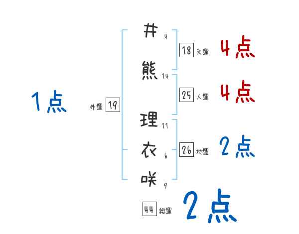 外運![]() | 井熊理衣咲さんの外運は19画の1つ星!優れた才能を持ちますが、協調性が足りないことも。周りの人と協力する事を意識しましょう。 生活面を象徴する運勢です。外部から受ける影響力を表し、結婚運、家庭運や職場、環境への順応性を表します。 |