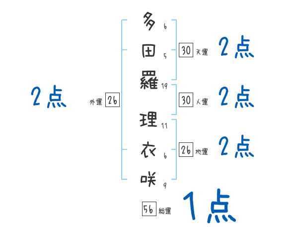 外運![]() | 多田羅理衣咲さんの外運は26画の2つ星!波瀾万丈かも。信頼できる人を大事にしましょう。 生活面を象徴する運勢です。外部から受ける影響力を表し、結婚運、家庭運や職場、環境への順応性を表します。 |