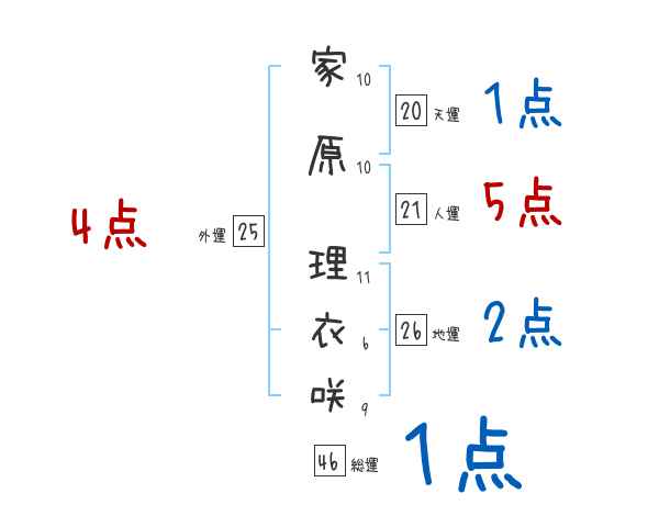 人運![]() | 家原理衣咲さんの人運は21画の5つ星!統率力がある。独立し成功する。名誉を手に入れる。 性格や才能などを表す2番目に重要な運勢です。人間関係や協調性、社会的な成功に影響します。主に20歳から50歳ぐらいまでの中年期の運勢を表します。 |