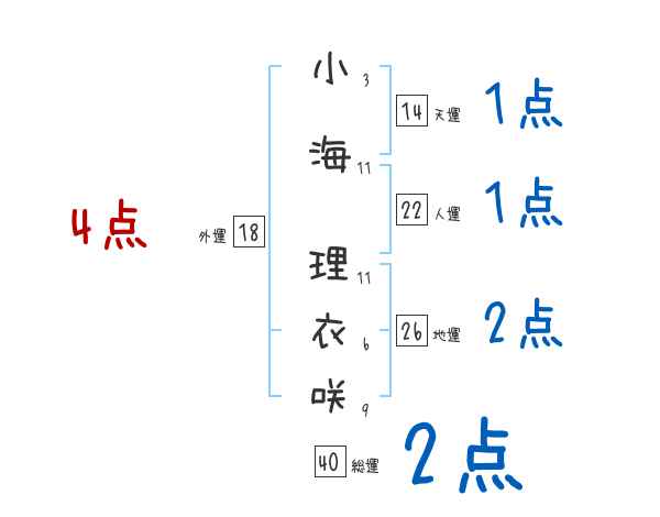外運![]() | 小海理衣咲さんの外運は18画の4つ星!情熱的で剛気。忍耐力があり信頼される。 生活面を象徴する運勢です。外部から受ける影響力を表し、結婚運、家庭運や職場、環境への順応性を表します。 |