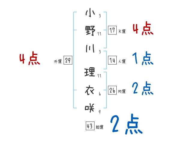 外運![]() | 小野川理衣咲さんの外運は29画の4つ星!完全主義で才能がある。厳格な心の持ち主。 生活面を象徴する運勢です。外部から受ける影響力を表し、結婚運、家庭運や職場、環境への順応性を表します。 |