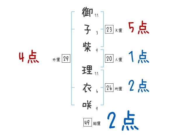 天運![]() | 御子柴理衣咲さんの天運は23画の5つ星!想像力に優れ活力がある。一代で成功し名誉を手に入れる。 家系が持つ宿命的な運勢を表します。祖先から受け継いだ苗字ですので自分の力が及びません。家柄を象徴します。 |