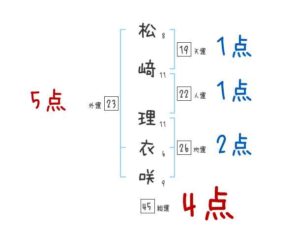 外運![]() | 松﨑理衣咲さんの外運は23画の5つ星!想像力に優れ活力がある。一代で成功し名誉を手に入れる。 生活面を象徴する運勢です。外部から受ける影響力を表し、結婚運、家庭運や職場、環境への順応性を表します。 |