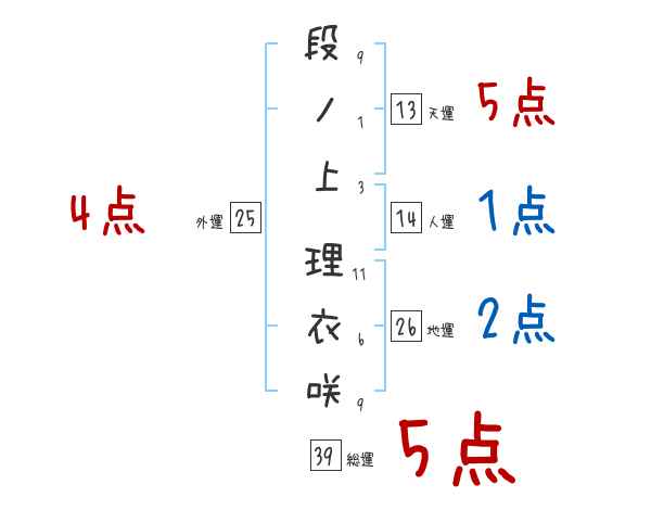 天運![]() | 段ノ上理衣咲さんの天運は13画の5つ星!才能に恵まれ人気がある。名声を手に入れる。円満な人生。 家系が持つ宿命的な運勢を表します。祖先から受け継いだ苗字ですので自分の力が及びません。家柄を象徴します。 |
