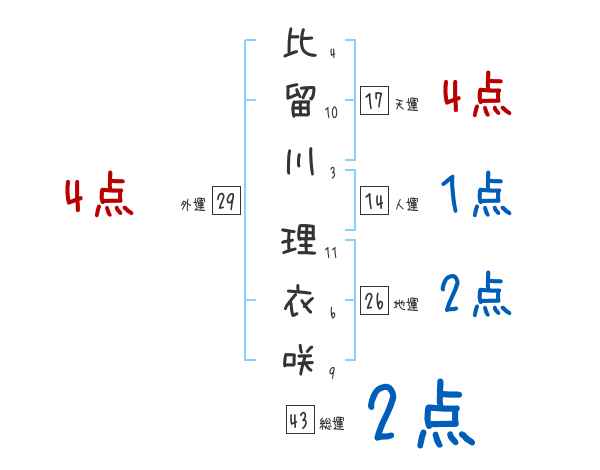 地運![]() | 比留川理衣咲さんの地運は26画の2つ星!波瀾万丈かも。信頼できる人を大事にしましょう。 個性を表す基礎的な運勢です。性格形成や対人関係、行動力など家庭環境に影響されます。主に誕生してから20歳くらいまでの若年期の運勢を表します。 |