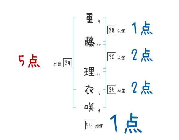 総運![]() | 重藤理衣咲さんの総運は54画の1つ星!トラブルが多いかも。周りをよく見て協調して過ごしましょう。 あなたの人生を表す1番重要な運勢です。生涯を通じて影響する総合運となり、主に50歳以降の晩年期に影響を及ぼします。 |