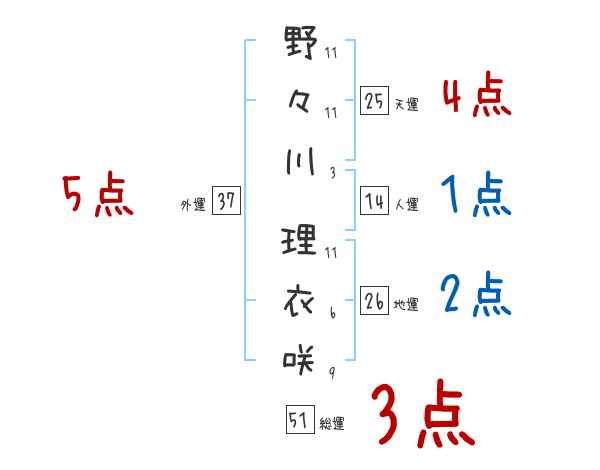 天運![]() | 野々川理衣咲さんの天運は25画の4つ星!個性があり才能があふれる。強運の持ち主で発展する。 家系が持つ宿命的な運勢を表します。祖先から受け継いだ苗字ですので自分の力が及びません。家柄を象徴します。 |