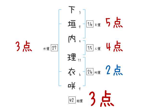 外運![]() | 下垣内理衣咲さんの外運は27画の3つ星!頭脳明晰だが強情で摩擦が多い傾向。孤立に注意。 生活面を象徴する運勢です。外部から受ける影響力を表し、結婚運、家庭運や職場、環境への順応性を表します。 |