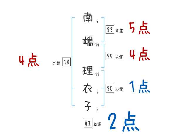 総運![]() | 南端理衣子さんの総運は43画の2つ星!頑固な性格で独立心が強いかも。やや非現実的で浪費に注意しましょう。 あなたの人生を表す1番重要な運勢です。生涯を通じて影響する総合運となり、主に50歳以降の晩年期に影響を及ぼします。 |