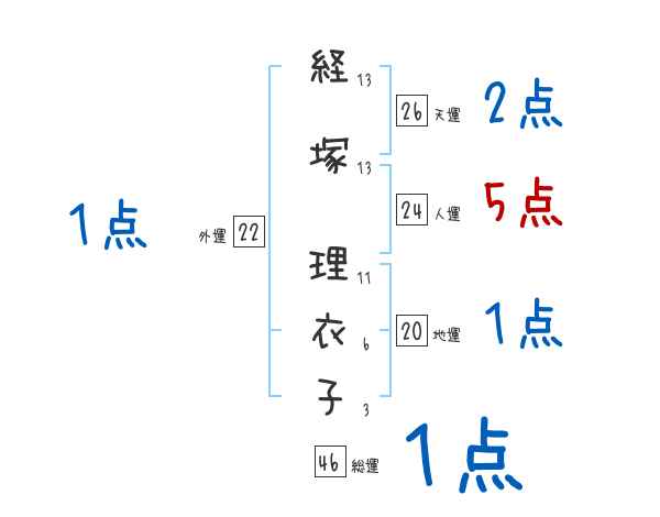 天運![]() | 経塚理衣子さんの天運は26画の2つ星!波瀾万丈かも。信頼できる人を大事にしましょう。 家系が持つ宿命的な運勢を表します。祖先から受け継いだ苗字ですので自分の力が及びません。家柄を象徴します。 |