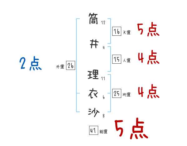 天運![]() | 筒井理衣沙さんの天運は16画の5つ星!人望が厚く大きく発展する。逆転成功が見える。 家系が持つ宿命的な運勢を表します。祖先から受け継いだ苗字ですので自分の力が及びません。家柄を象徴します。 |