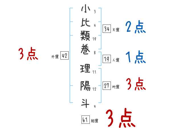 外運![]() | 小比類巻理陽斗さんの外運は42画の3つ星!病気に注意。多芸であるが消極的でおとなしい。 生活面を象徴する運勢です。外部から受ける影響力を表し、結婚運、家庭運や職場、環境への順応性を表します。 |