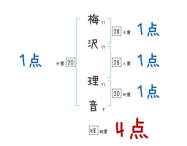 天運![]() | 梅沢理音さんの天運は28画の1つ星!家庭環境に注意。スポーツで活躍できる能力があるかも。 家系が持つ宿命的な運勢を表します。祖先から受け継いだ苗字ですので自分の力が及びません。家柄を象徴します。 |