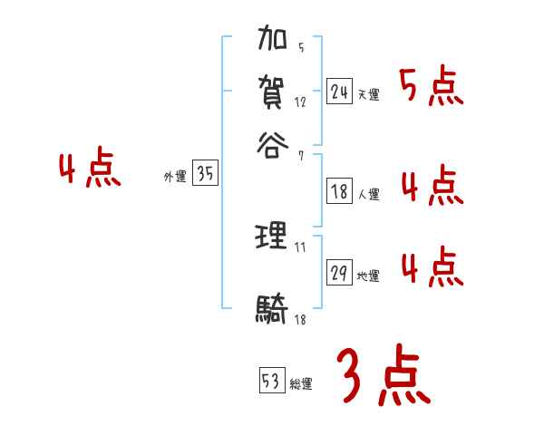 外運![]() | 加賀谷理騎さんの外運は35画の4つ星!温厚な性格で感受性が高い。穏和な性格で人望が厚い。 生活面を象徴する運勢です。外部から受ける影響力を表し、結婚運、家庭運や職場、環境への順応性を表します。 |