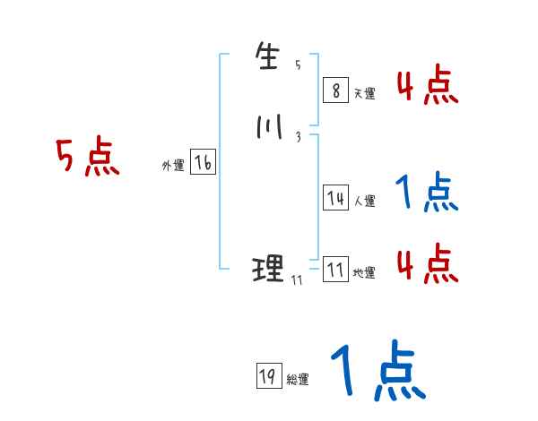 外運![]() | 生川理さんの外運は16画の5つ星!人望が厚く大きく発展する。逆転成功が見える。 生活面を象徴する運勢です。外部から受ける影響力を表し、結婚運、家庭運や職場、環境への順応性を表します。 |