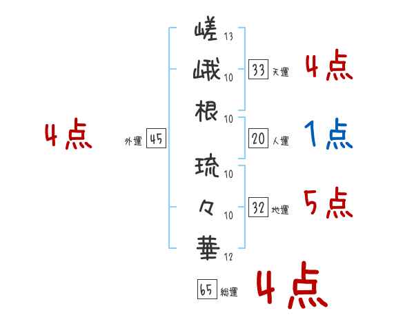 地運![]() | 嵯峨根琉々華さんの地運は32画の5つ星!柔軟性があり成功する。チャンスが多く金運が良い。 個性を表す基礎的な運勢です。性格形成や対人関係、行動力など家庭環境に影響されます。主に誕生してから20歳くらいまでの若年期の運勢を表します。 |