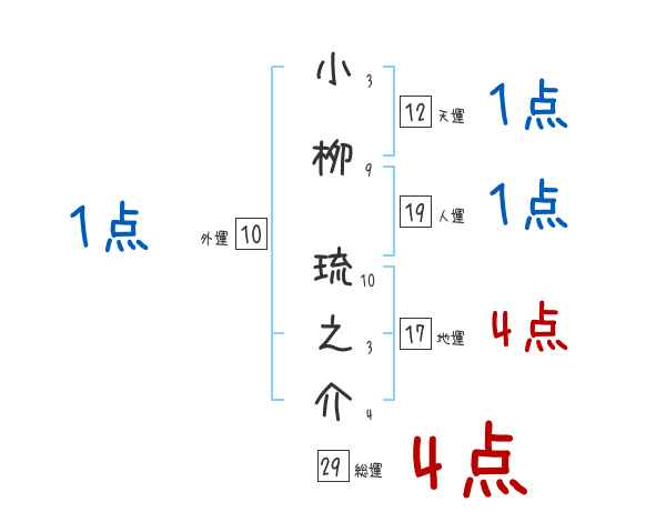 天運![]() | 小栁琉之介さんの天運は12画の1つ星!簡単な失敗で諦めてしまいやすいかも。着実に行動すると良いでしょう。 家系が持つ宿命的な運勢を表します。祖先から受け継いだ苗字ですので自分の力が及びません。家柄を象徴します。 |