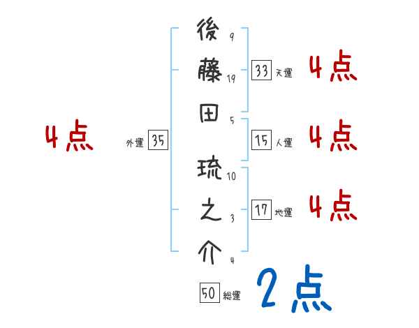 外運![]() | 後藤田琉之介さんの外運は35画の4つ星!温厚な性格で感受性が高い。穏和な性格で人望が厚い。 生活面を象徴する運勢です。外部から受ける影響力を表し、結婚運、家庭運や職場、環境への順応性を表します。 |