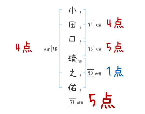 外運![]() | 小田口琉之佑さんの外運は18画の4つ星!情熱的で剛気。忍耐力があり信頼される。 生活面を象徴する運勢です。外部から受ける影響力を表し、結婚運、家庭運や職場、環境への順応性を表します。 |