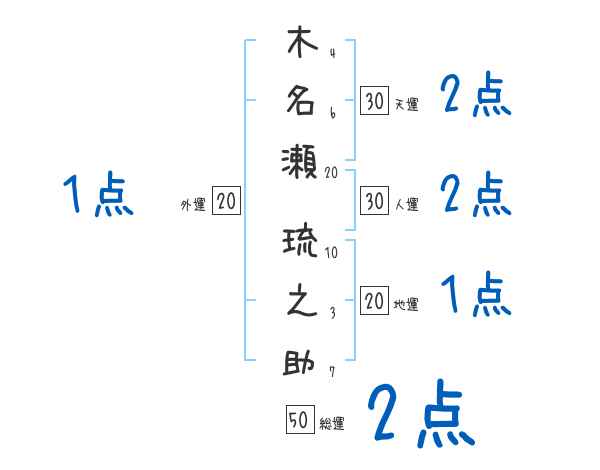 天運![]() | 木名瀬琉之助さんの天運は30画の2つ星!浮き沈みの激しさに注意しましょう。 家系が持つ宿命的な運勢を表します。祖先から受け継いだ苗字ですので自分の力が及びません。家柄を象徴します。 |
