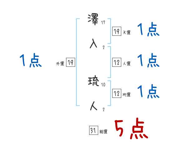 総運![]() | 澤入琉人さんの総運は31画の5つ星!社交性があり判断力に優れる。順風満帆な人生で円満な生活。 あなたの人生を表す1番重要な運勢です。生涯を通じて影響する総合運となり、主に50歳以降の晩年期に影響を及ぼします。 |