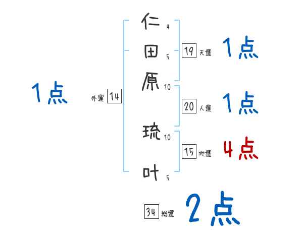 外運![]() | 仁田原琉叶さんの外運は14画の1つ星!人に対して優しいがストレスを溜め込みがち。人間関係のトラブルを避けるよう気をつけましょう。 生活面を象徴する運勢です。外部から受ける影響力を表し、結婚運、家庭運や職場、環境への順応性を表します。 |