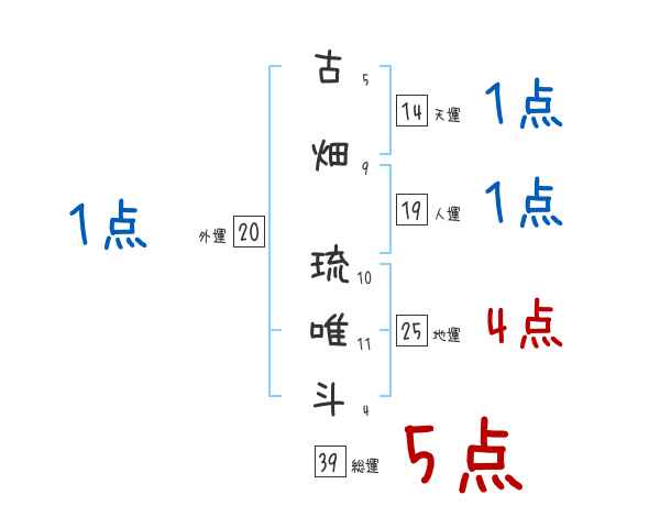 天運![]() | 古畑琉唯斗さんの天運は14画の1つ星!人に対して優しいがストレスを溜め込みがち。人間関係のトラブルを避けるよう気をつけましょう。 家系が持つ宿命的な運勢を表します。祖先から受け継いだ苗字ですので自分の力が及びません。家柄を象徴します。 |