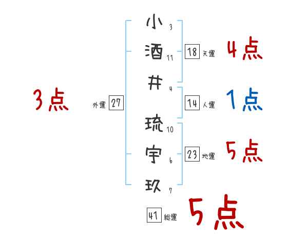 天運![]() | 小酒井琉宇玖さんの天運は18画の4つ星!情熱的で剛気。忍耐力があり信頼される。 家系が持つ宿命的な運勢を表します。祖先から受け継いだ苗字ですので自分の力が及びません。家柄を象徴します。 |