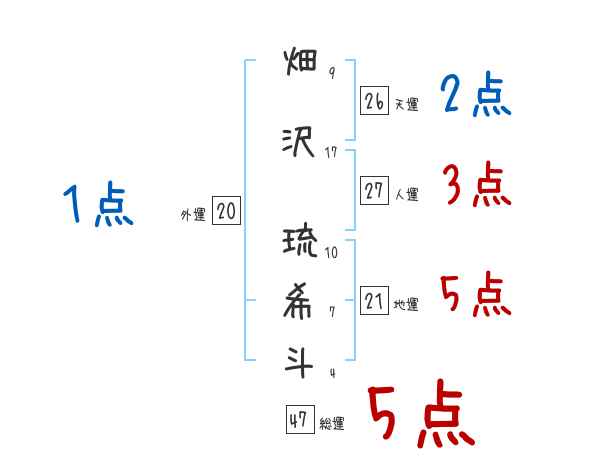 総運![]() | 畑沢琉希斗さんの総運は47画の5つ星!実力が開花し発展する円満な人生。財に恵まれる。 あなたの人生を表す1番重要な運勢です。生涯を通じて影響する総合運となり、主に50歳以降の晩年期に影響を及ぼします。 |