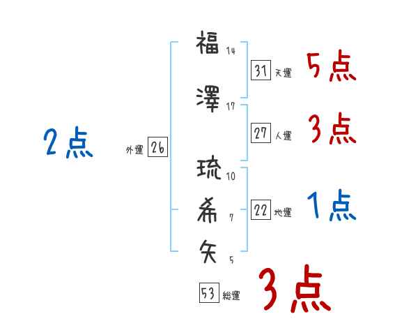 外運![]() | 福澤琉希矢さんの外運は26画の2つ星!波瀾万丈かも。信頼できる人を大事にしましょう。 生活面を象徴する運勢です。外部から受ける影響力を表し、結婚運、家庭運や職場、環境への順応性を表します。 |