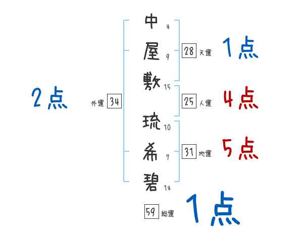 天運![]() | 中屋敷琉希碧さんの天運は28画の1つ星!家庭環境に注意。スポーツで活躍できる能力があるかも。 家系が持つ宿命的な運勢を表します。祖先から受け継いだ苗字ですので自分の力が及びません。家柄を象徴します。 |