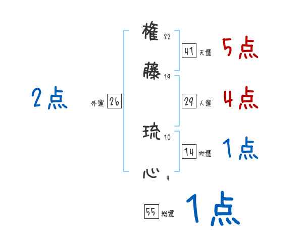 外運![]() | 権藤琉心さんの外運は26画の2つ星!波瀾万丈かも。信頼できる人を大事にしましょう。 生活面を象徴する運勢です。外部から受ける影響力を表し、結婚運、家庭運や職場、環境への順応性を表します。 |