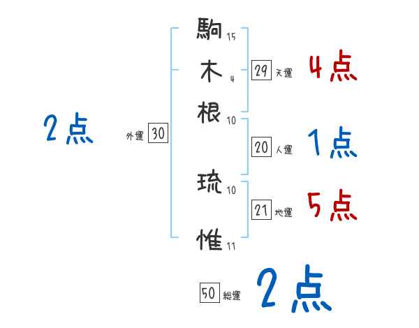 外運![]() | 駒木根琉惟さんの外運は30画の2つ星!浮き沈みの激しさに注意しましょう。 生活面を象徴する運勢です。外部から受ける影響力を表し、結婚運、家庭運や職場、環境への順応性を表します。 |