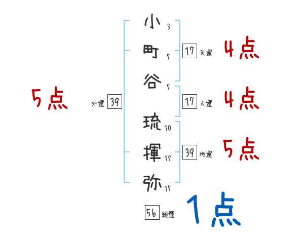 外運![]() | 小町谷琉揮弥さんの外運は39画の5つ星!社交性に優れ人望が厚い。人の上に立ち成功する。 生活面を象徴する運勢です。外部から受ける影響力を表し、結婚運、家庭運や職場、環境への順応性を表します。 |