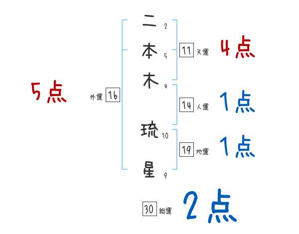 天運![]() | 二本木琉星さんの天運は11画の4つ星!着実に富や地位を得る幸運な人生。 家系が持つ宿命的な運勢を表します。祖先から受け継いだ苗字ですので自分の力が及びません。家柄を象徴します。 |
