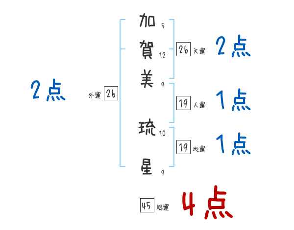 外運![]() | 加賀美琉星さんの外運は26画の2つ星!波瀾万丈かも。信頼できる人を大事にしましょう。 生活面を象徴する運勢です。外部から受ける影響力を表し、結婚運、家庭運や職場、環境への順応性を表します。 |