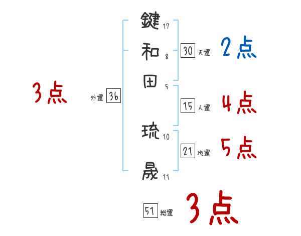 総運![]() | 鍵和田琉晟さんの総運は51画の3つ星!変化が激しく、危険に注意。堅実な性格。 あなたの人生を表す1番重要な運勢です。生涯を通じて影響する総合運となり、主に50歳以降の晩年期に影響を及ぼします。 |