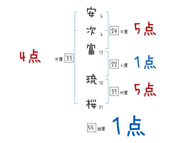 天運![]() | 安次富琉桜さんの天運は24画の5つ星!家庭運が良く順調な人生。金運にも恵まれる。 家系が持つ宿命的な運勢を表します。祖先から受け継いだ苗字ですので自分の力が及びません。家柄を象徴します。 |