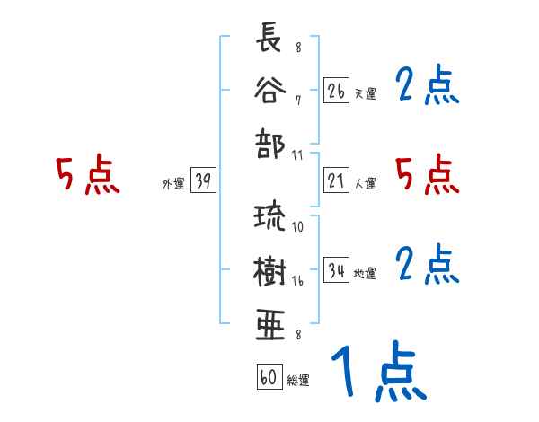 天運![]() | 長谷部琉樹亜さんの天運は26画の2つ星!波瀾万丈かも。信頼できる人を大事にしましょう。 家系が持つ宿命的な運勢を表します。祖先から受け継いだ苗字ですので自分の力が及びません。家柄を象徴します。 |