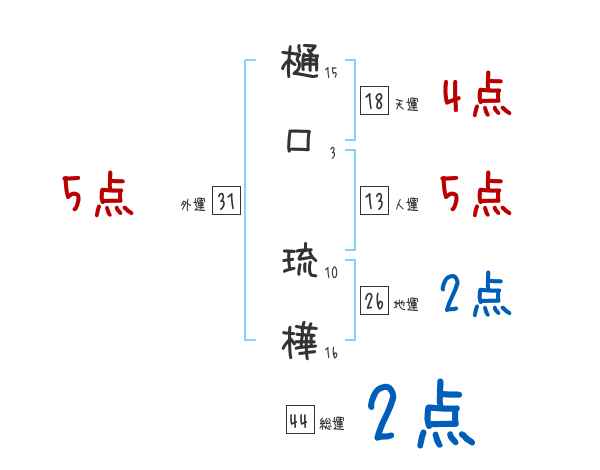 天運![]() | 樋口琉樺さんの天運は18画の4つ星!情熱的で剛気。忍耐力があり信頼される。 家系が持つ宿命的な運勢を表します。祖先から受け継いだ苗字ですので自分の力が及びません。家柄を象徴します。 |