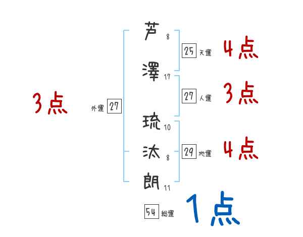 | 人運  | 芦澤琉汰朗さんの人運は27画の3つ星!頭脳明晰だが強情で摩擦が多い傾向。孤立に注意。性格や才能などを表す2番目に重要な運勢です。人間関係や協調性、社会的な成功に影響します。主に20歳から50歳ぐらいまでの中年期の運勢を表します。 |