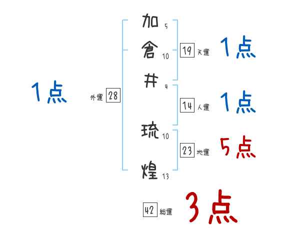 外運![]() | 加倉井琉煌さんの外運は28画の1つ星!家庭環境に注意。スポーツで活躍できる能力があるかも。 生活面を象徴する運勢です。外部から受ける影響力を表し、結婚運、家庭運や職場、環境への順応性を表します。 |