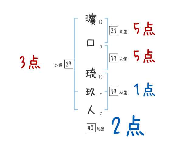 天運![]() | 濵口琉玖人さんの天運は21画の5つ星!統率力がある。独立し成功する。名誉を手に入れる。 家系が持つ宿命的な運勢を表します。祖先から受け継いだ苗字ですので自分の力が及びません。家柄を象徴します。 |