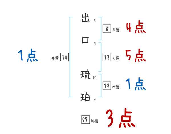外運![]() | 出口琉珀さんの外運は14画の1つ星!人に対して優しいがストレスを溜め込みがち。人間関係のトラブルを避けるよう気をつけましょう。 生活面を象徴する運勢です。外部から受ける影響力を表し、結婚運、家庭運や職場、環境への順応性を表します。 |