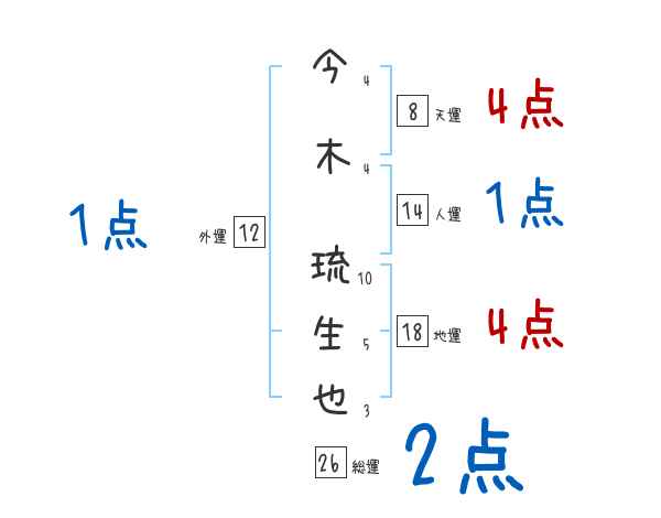 総運![]() | 今木琉生也さんの総運は26画の2つ星!波瀾万丈かも。信頼できる人を大事にしましょう。 あなたの人生を表す1番重要な運勢です。生涯を通じて影響する総合運となり、主に50歳以降の晩年期に影響を及ぼします。 |
