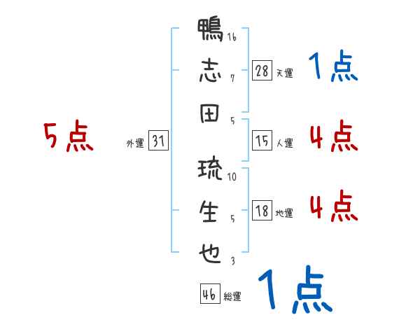 天運![]() | 鴨志田琉生也さんの天運は28画の1つ星!家庭環境に注意。スポーツで活躍できる能力があるかも。 家系が持つ宿命的な運勢を表します。祖先から受け継いだ苗字ですので自分の力が及びません。家柄を象徴します。 |