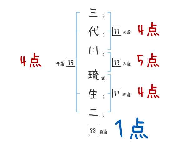 総運![]() | 三代川琉生二さんの総運は28画の1つ星!家庭環境に注意。スポーツで活躍できる能力があるかも。 あなたの人生を表す1番重要な運勢です。生涯を通じて影響する総合運となり、主に50歳以降の晩年期に影響を及ぼします。 |
